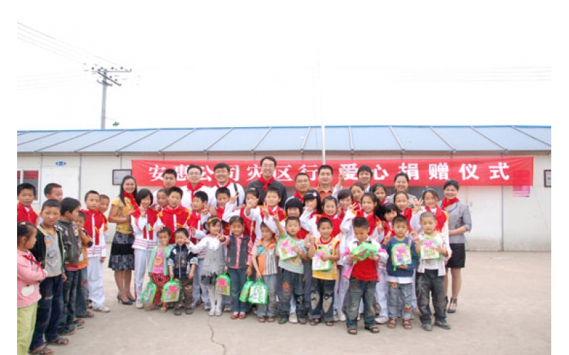 2009年5月12-13日,安惠公司舉行大地震周年系列紀念活動。副總經理柯建民再赴德陽,給綿竹拱星小學孩子們送去“愛心包裹”。