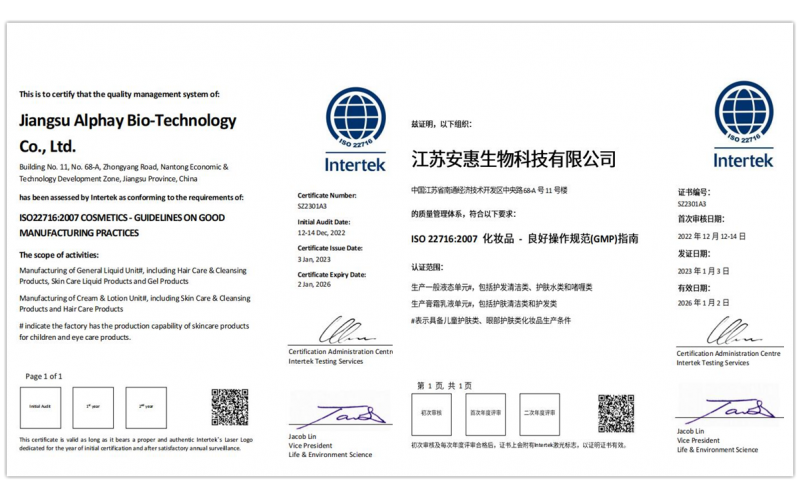 2023年1月,安惠公司化妝品生產(chǎn)系統(tǒng)順利通過認(rèn)證公司Intertek的嚴(yán)格審核,獲得ISO22716質(zhì)量管理體系認(rèn)證,即國際化妝品GMP認(rèn)證。化妝品GMP管理系統(tǒng)的目標(biāo)是通過對生產(chǎn)流程中的每項工作、每個環(huán)節(jié)和每道工序都進(jìn)行高標(biāo)準(zhǔn)的規(guī)范和要求,消除和防止產(chǎn)品在制造過程中的質(zhì)量缺陷,避免化妝品產(chǎn)品對使用者的潛在危險;GMP認(rèn)證的最大優(yōu)點(diǎn)是證實(shí)生產(chǎn)企業(yè)的廠房、人員、設(shè)施、材料的采購和使用及產(chǎn)品制造過程控制、工廠和人員衛(wèi)生管理、質(zhì)量管理體系均達(dá)到了世界先進(jìn)水平。