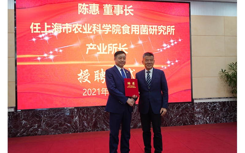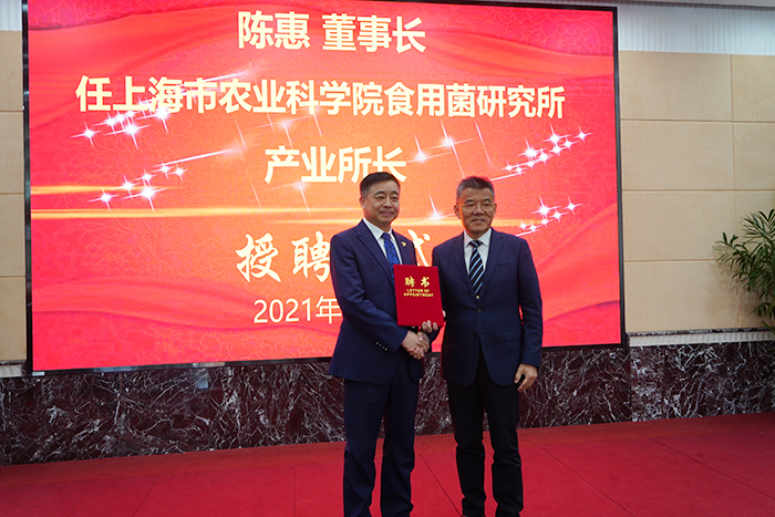 2021年3月22日,上海市農(nóng)業(yè)科學(xué)院食用菌研究所與江蘇安惠生物科技有限公司共同成立“聯(lián)合科技創(chuàng)新中心”舉行揭牌儀式。會上,安惠公司董事長陳惠受聘該院食用菌研究所產(chǎn)業(yè)所長。